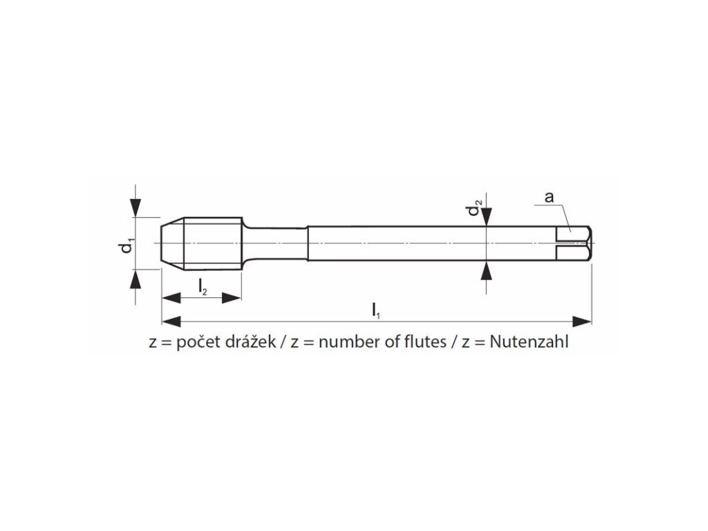 Skupina obráběného materiálu: Doporučené použití / řezná rychlost Vc: Cementační a nitridační oceli do 1100 N/mm2 - 6-8 m/min Nástrojové oceli do 1100 N/mm2 - 6-8 M/min Nerezavějící a žáruvzdorné oceli 450-850 N/mm2 - 8-14 m/min Nerezové a žáruvzdorné oceli 600-1000 N/mm2 - 6-10 m/min Tvárná a temperovaná litina - 7-10 m/min Měď čistá bez přísad - 8-12 m/min Slitiny mědi s dlouhou vinutou třískou - 10-15 m/min Závit - M metrický ISO Typ VA - závitník pro nerezavějící oceli Norma - DIN 376 Materiál závitníku - HSSE vysoce výkonná legovaná ocel kobaltem 5% Tolerance - ISO 2 6H Povlakováno - TiN Vhodné pro řezání závitu: do otvoru nepřechodného (slepý) Chlazení - řezací olej, emulzeDodatočné parametre