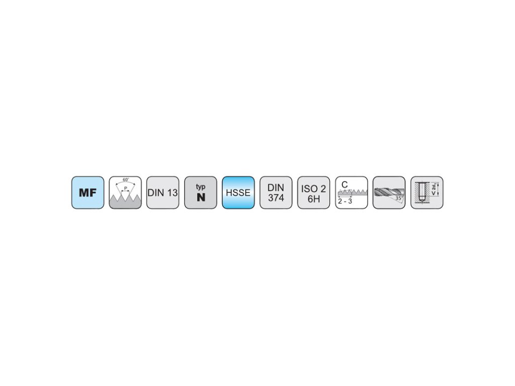 Skupina obráběného materiálu: Doporučené použití / řezná rychlost Vc: Nelegované lité oceli do 800 N/mm2 - 12-15 m/min Konstrukční a zušlechtěné oceli do 800 N/mm2 - 12-15 m/min Hliník legovaný s obsahem Si < 10% - 15-30 m/min Možné použití: Tvárná a temperovaná litina - 6-8 m/min Hliník legovaný s obsahem Si > 10% - 14-20 m/min Slitiny mědi s dlouhou vinutou třískou - 10-15 m/min Závit - MF metrický ISO Typ N - závitník pro oceli s pevností do 800 N/mm2 Norma - DIN 374 Materiál závitníku - HSSE vysoce výkonná legovaná ocel kobaltem 5% Tolerance - ISO 2 6H Povlakováno - TiN Vhodné pro řezání závitu: do otvoru - nepřechodný (délka závitu < 2xd1) Chlazení - řezací olej, emulzeDodatočné parametre