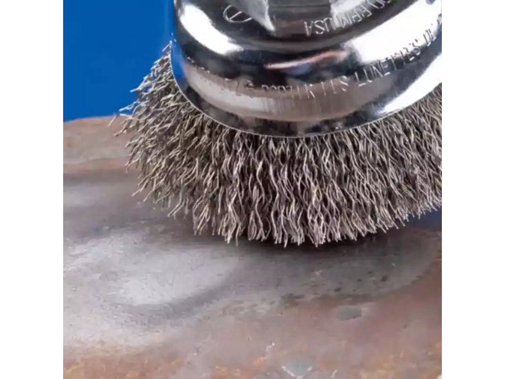 Hrncová kefa zvlnený drôt sa používa s uhlovou brúskou na opracovanie veľkých plôch - odhrdzenie, leštenie, odstránenie farby, nečistôt alebo zápalov.