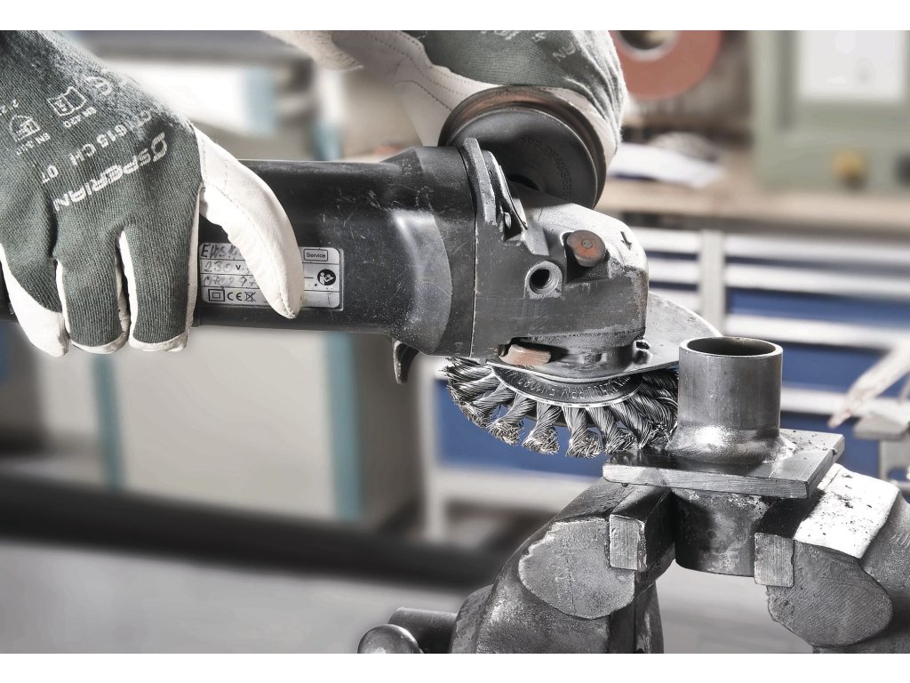 Podobne ako kužeľové kefy sú rotačné kefy so závitom ideálne na dosiahnutie ťažko dostupných miest. Zvyčajne sa používajú na uhlových brúskach.