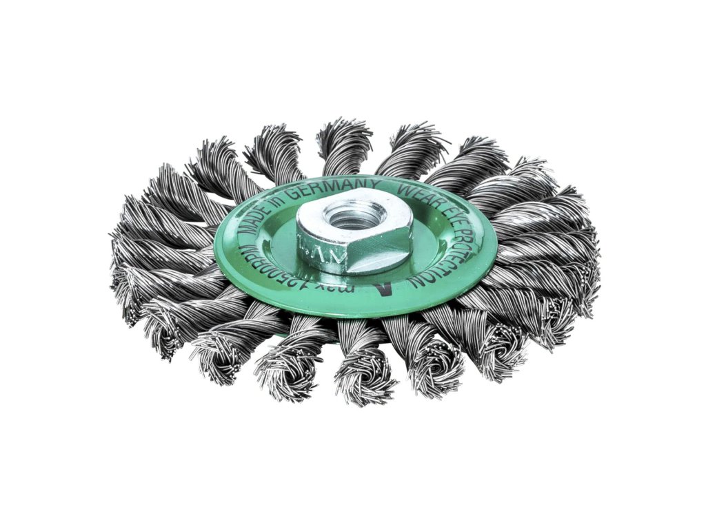 473817 | Rotačná kefa splietaná, jednoradová vysokopevný nerezový drôt hladký 0,50, priemer 125x14xM14x2,0 mm
