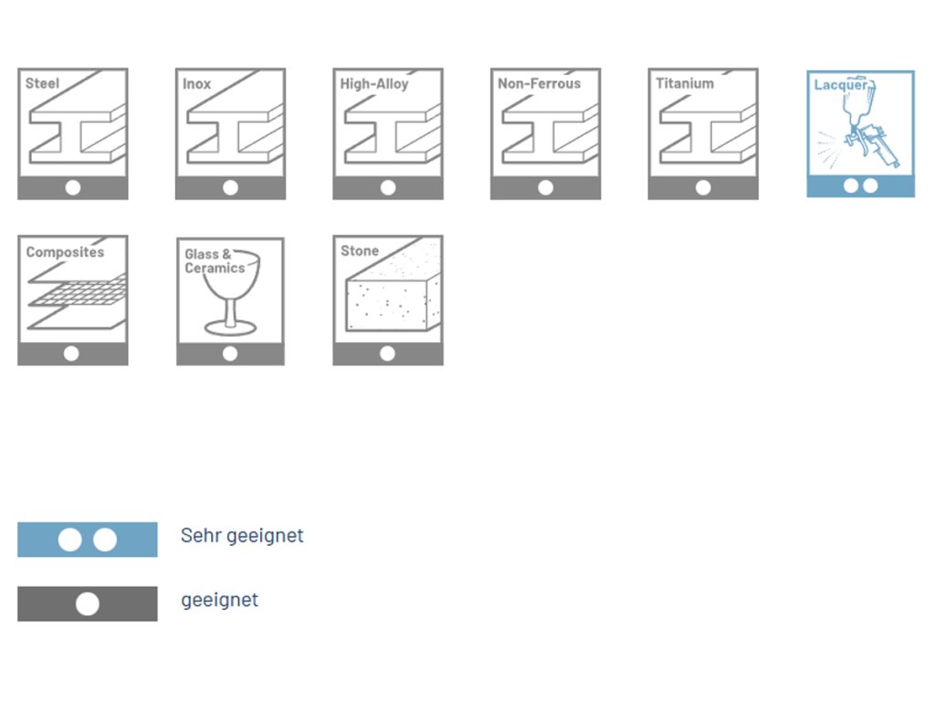 | Obrábaný materiál: | nerez, sklo, keramika, vysokolegované zliatiny, lakovaný povrch, neželezné kovy/farebné kovy, oceľ, kameň, titan a zliatiny, kompozity |