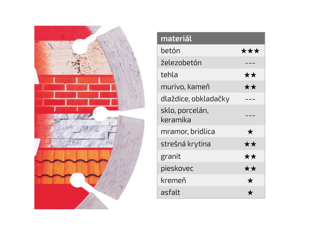 Kvalitný diamantový rezný kotúč na profesionálne a poloprofesionálne použitie, vhodný najmä na rezanie betónu, kameňa, žuly, strešných škridiel a tehál.