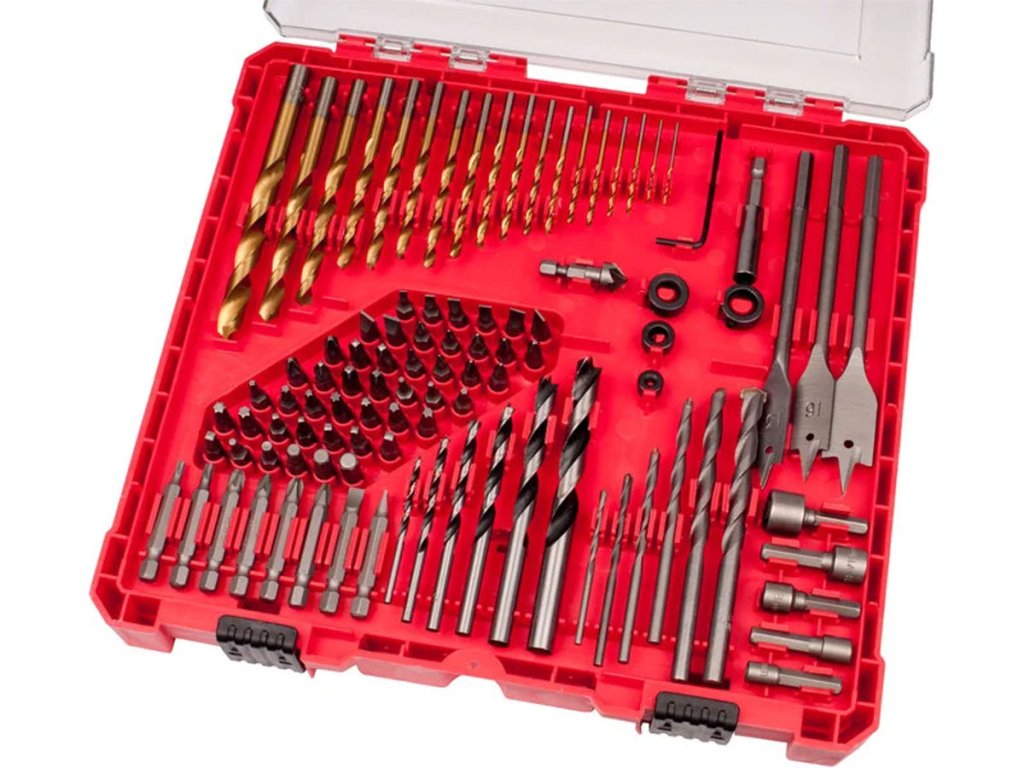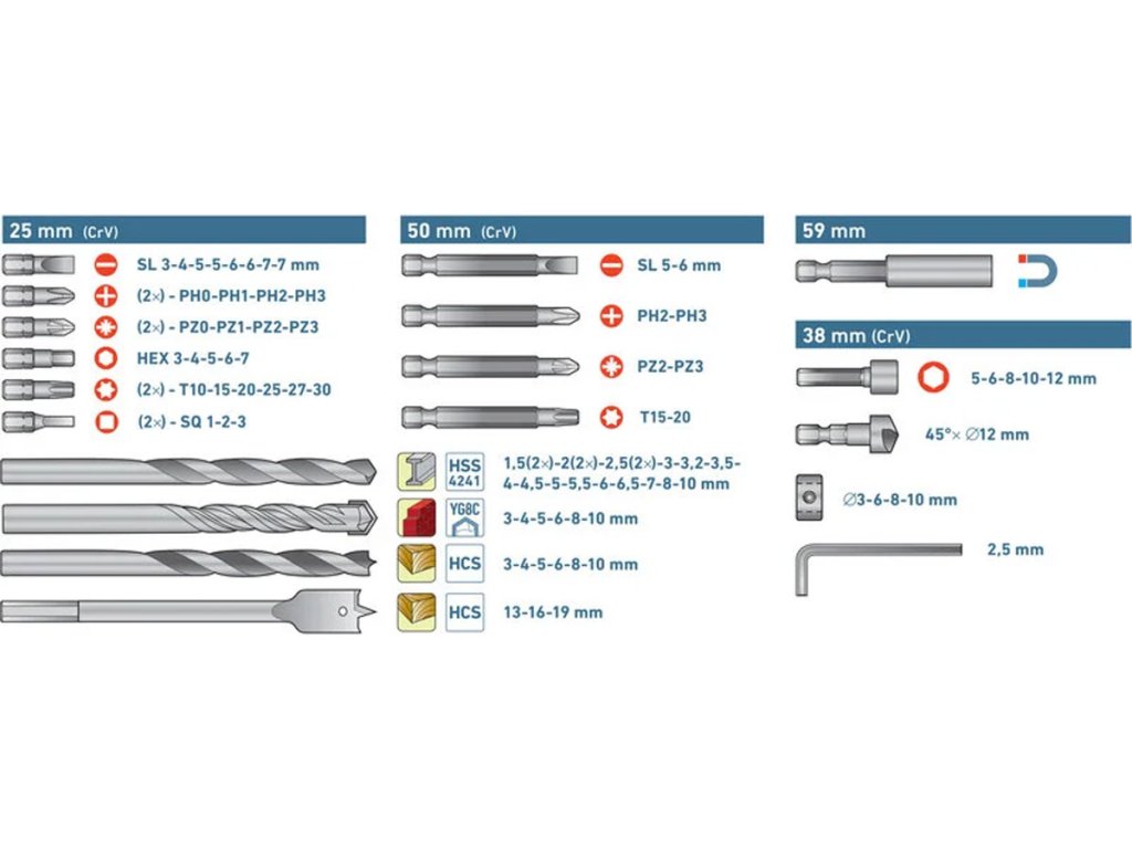 100-dielna sada, vrtáky do kovu: ø1,5-1,5-2-2-2,5-2,5-3-3,2-3,5-4-4,5-4,8-5-5,5-6-6,5-7-8-10mm, vrtáky do dreva: ø3-4-5-6-8-10-13-16-19mm, vrtáky do muriva: ø3-4-5-6-8-10mm, bity 1/4"x25mm: (-)3-4-5-5-6-6-7-7mm, PH0-0-1-1-2-2-3-3, PZ0-0-1-1-2-2-3-3, HEX H3-4-5-6-7mm, TORX T10-10-15-15-20-20-25-25-27-27-30-30, SQ1-1-2-2-3-3, nástrčné hlavice (38mm): 5-6-8-10-12mm, magnetický nadstavec 59mm, záhlbník 1/4"x45°x12mm, hĺbkové dorazy k vrtákom ø3-6-8-10mm, L-imbus 2,5mm