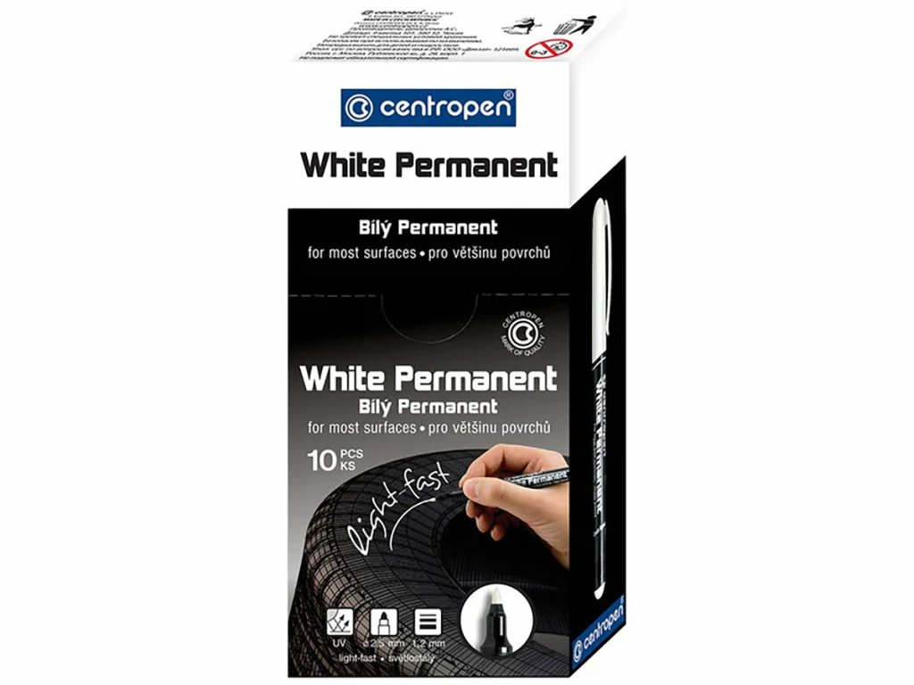 Univerzálny biely svetlostály popisovač s okrúhlym hrotom s atramentom na vodnej báze, vhodný na väčšinu povrchov. Po zaschnutí odolá oteru, je permanentný na poréznych povrchoch.