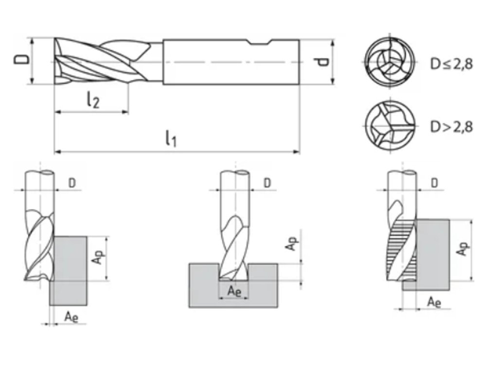 Minifrézy krátké, typ N, ploška weldon, vyrobené z rychlořezné oceli HSS Co8, vhodné na frézovanie na hotovo, drážkování a hrubování, pro obrábění ocelí, nerezových ocelí a litiny.
